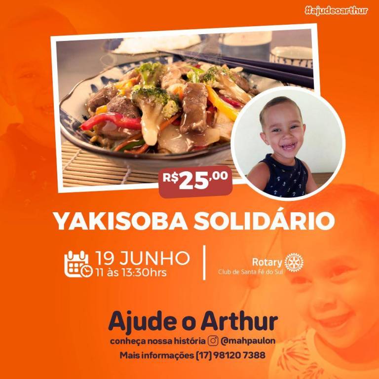O Rotary Club de Santa Fé do Sul em apoio a campanha de arrecadação de fundos para a cirguria do Arthur, juntamente com voluntários irá realizar um delicioso Yakisoba. A renda 100% destinada a cirurgia do pequeno Arthur que nasceu com uma mal formação conhecida por ANGULAÇÃO CONGÊNITA POSTERIOR-MEDIAL da tíbia direita. Devido a isso, precisa de uma cirurgia de reconstrução óssea, estimada em R$ 100 mil reais. Colabore aquirindo o Yakisoba, ou então pela vaquinha online: http://vaka.me/1951696 ou ainda por PIX: 566.883.828.57 Banco Sicoob.