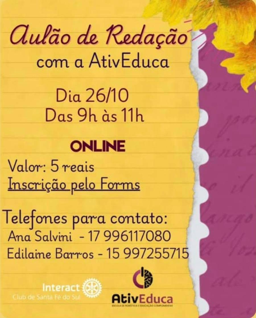 Boa tarde, conselheiros! O Interact Santa Fé do Sul, em parceria com a Ativa Educa, está promovendo um aulão de redação online para ajudar os jovens a se prepararem para o ENEM! ðŸ“✨